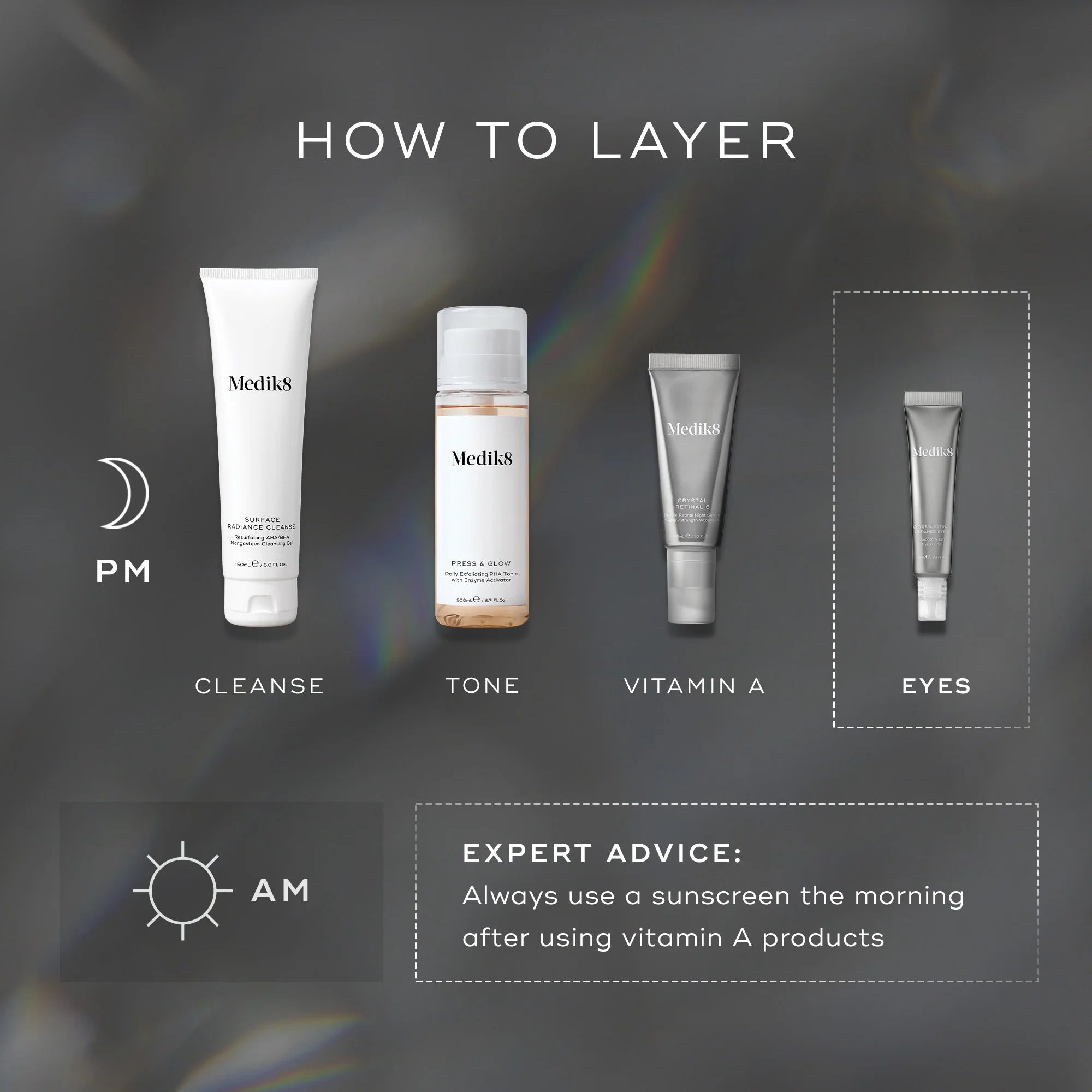 Restore the appearance of youthful eyes with Medik8’s new all-in-one solution to nighttime eye care. Inspired by the original groundbreaking vitamin A facial serum Crystal Retinal, completely reinvented into an overnight eye-specialist cream. Discover stabilised retinaldehyde, expertly optimised for the eye area and available in 3 strengths for progressive visible results that become more evident over time.